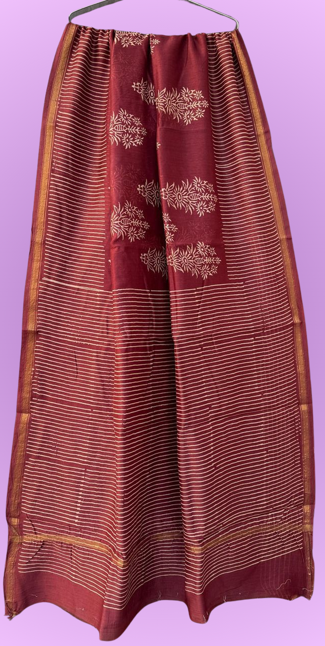 Afsana is a tale of tradition captured in fabric. Handcrafted with authentic Chanderi silk, its fine texture and subtle sheen create an aura of timeless sophistication. This saree is elegance, woven into every thread.
