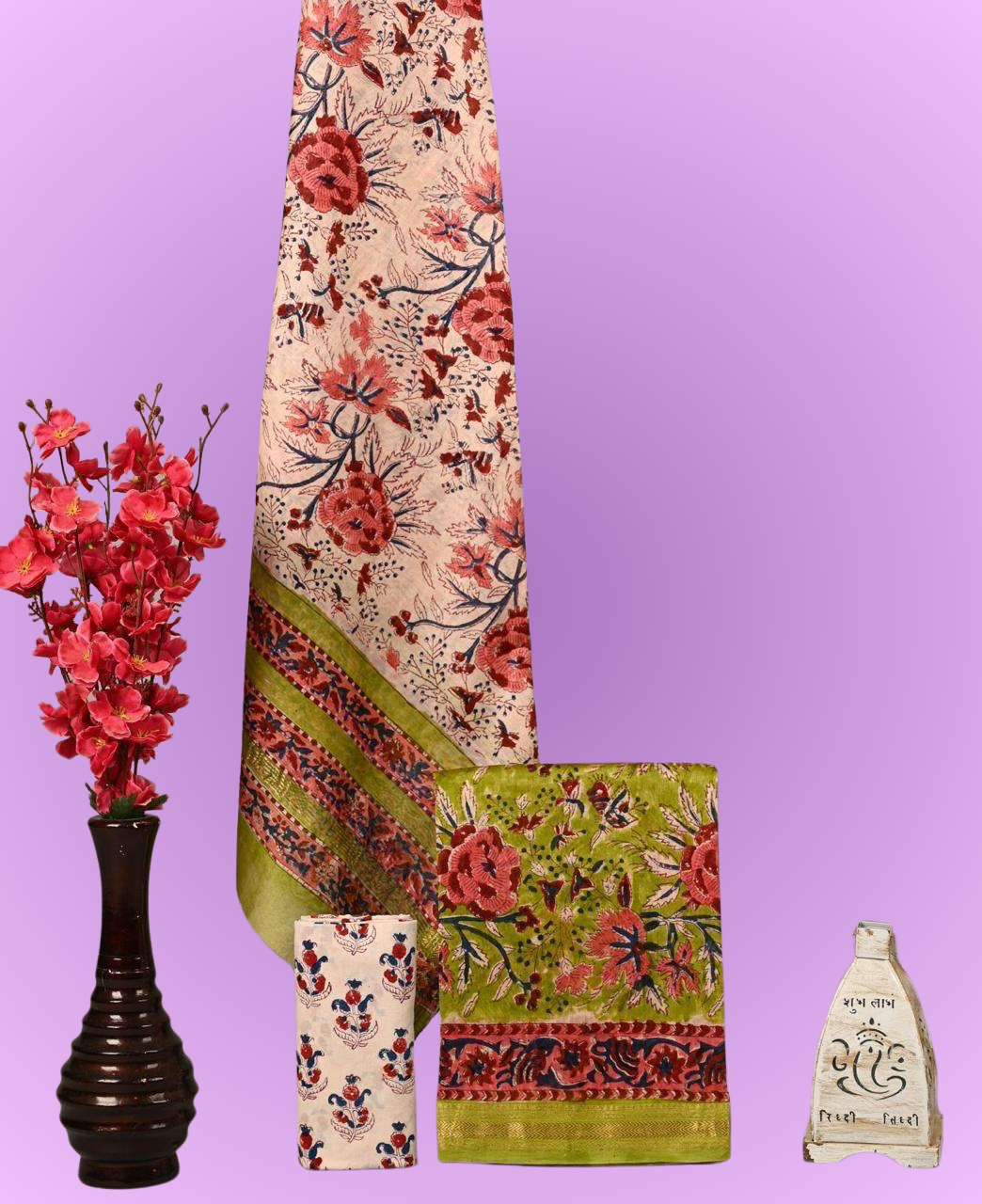 Discover the fragrance of tradition with Sugandha. This suit captures the essence of grace in every weave. Crafted in Chanderi silk, it blends royal charm with breathable comfort, making it a timeless treasure.
